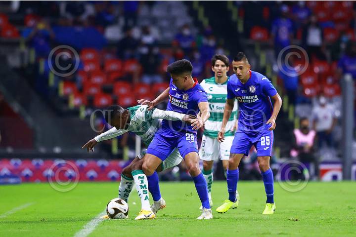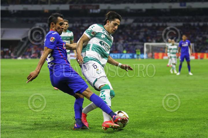 Guillermo Fernández, jugador de Cruz Azul, disputa el balón con un jugador de Santos.