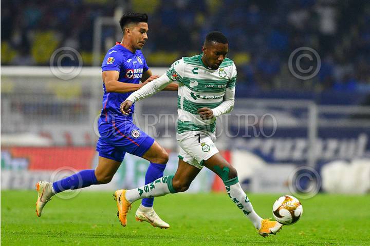 Juan Otero, delantero de Santos, escapa de la marca de Pol Fernández, mediocampista de Cruz Azul.