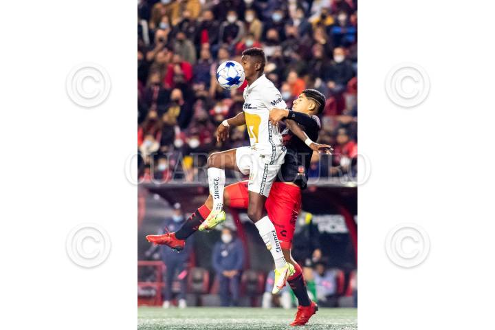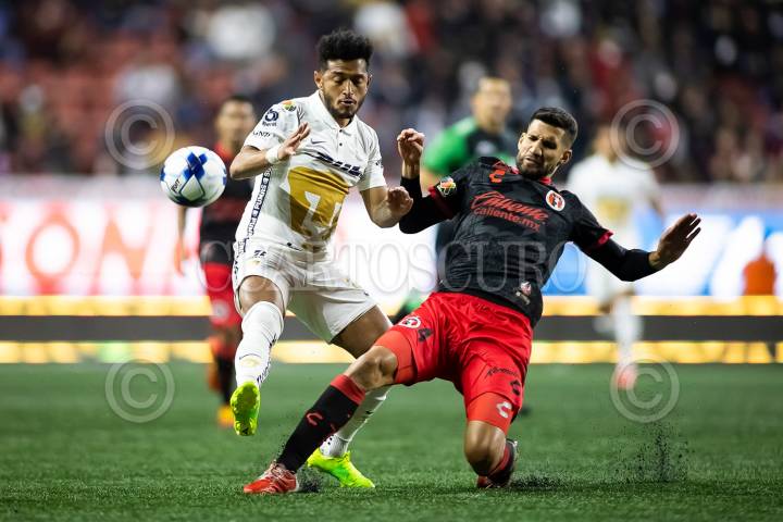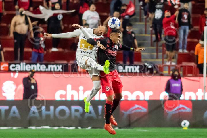 Arturo "Palermo" Ortiz (Pumas) y Mauro Manotas (Tijuana) disputan un balón por los aires en el partido en el estadio Caliente.