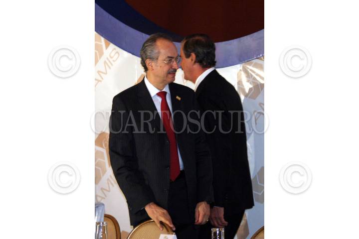 MEXICO, D.F. 23MAYO2005.- Francisco Gil Díaz, secretario de Hacienda y el presidente Vicente Fox, durante la inaugfuraciòn, de la 15a Convenciòn Nacional de Aseguradores ¨Factores para el desarrollo del mercado de seguros en México¨. FOTO: Sandra Perdomo/CUARTOSCURO.COM