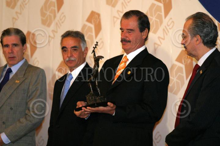 MEXICO, D.F. 23MAYO2005.- Al centro el presidente Vicente Fox, entrego el premio ¨Guerrero Azteca¨ durante la 15a Cconvenciòn de la AMIS. En la imagen Julio Frenk, secretario de Salud, Rolando Vega Saenz, presidente de la AMIS, Francisco Gil Díaz, secretario de Hacienda. FOTO: Sandra Perdomo/CUARTOSCURO.COM