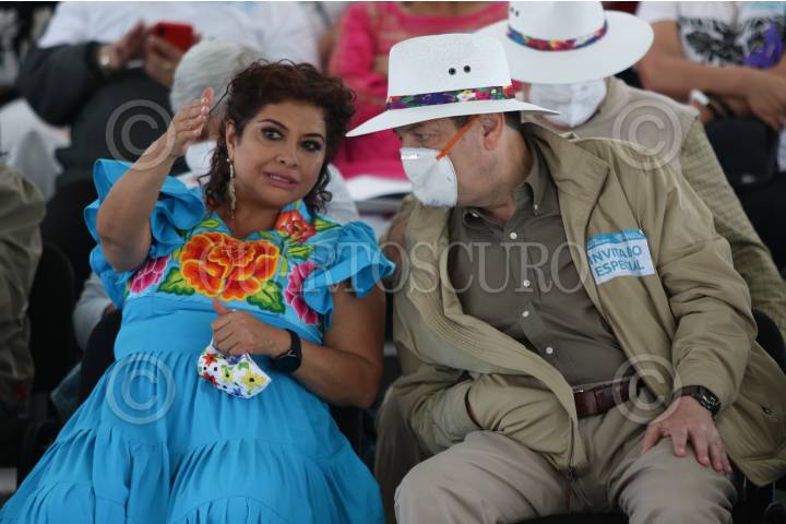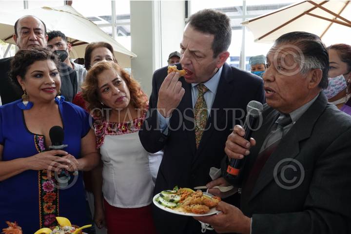 Clara Brugada, alcaldesa de Iztapalapa, y Fadlala Akabani, secretario de Desarrollo Económico, degustan los platillo de pescado y mariscos durante la inauguración de la 16a edición en la Utopía Cuauhtlicalli