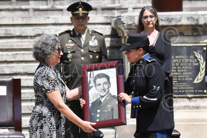 CIUDAD DE MÉXICO, 08MAYO2025.- Ricardo Trevilla, secretario de la Defensa Nacional y Óscar René Rubio, comandante de la Fuerza Aérea Mexicana, encabezaron la ceremonia póstuma en Honor al Sargento 1/o. de Transmisiones Retirado César Maximiliano Gutiérrez Marín, último integrante del "Escuadrón 201" unidad aérea mexicana que participó en la segunda guerra mundial. La ceremonia fue realizada en el monumento a la Fuerza Aérea Expedicionaria Mexicana ubicado en el Bosque de Chapultepec. En la imagen, una mujer de la Fuerza Aérea entrega una fotografía del sargento fallecido a una de sus hijas. FOTO: MARIO JASSO/CUARTOSCURO.COM