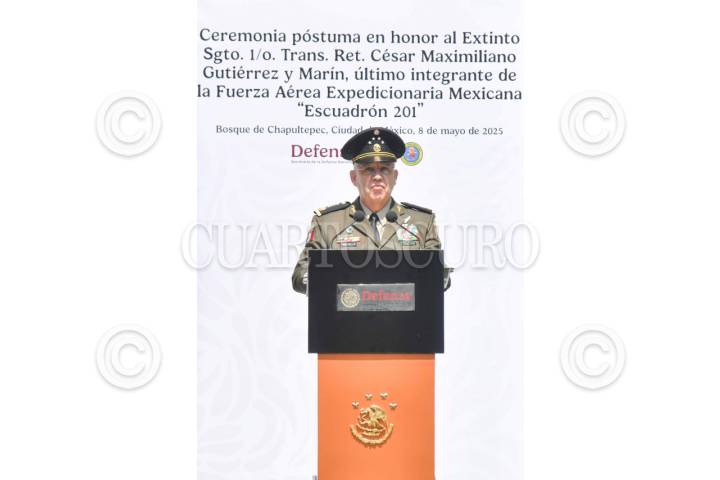 CIUDAD DE MÉXICO, 08MAYO2025.- Ricardo Trevilla, secretario de la Defensa Nacional, durante su intervención en la ceremonia póstuma en Honor al Sargento 1/o. de Transmisiones Retirado César Maximiliano Gutiérrez Marín, último integrante del "Escuadrón 201" unidad aérea mexicana que participó en la segunda guerra mundial. FOTO: MARIO JASSO/CUARTOSCURO.COM
