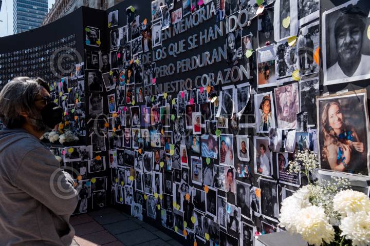 Un hombre observa las fotos del altar a víctimas de Covid-19 colocado en la plaza Tolsa en el Centro Histórico.