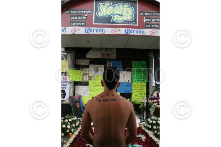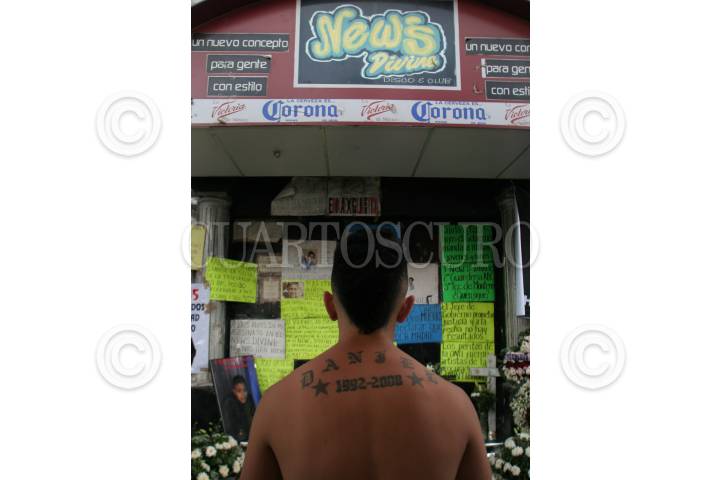 MÉXICO, D.F., 20JUNIO2010.- Alfredo Ascorve Dominguez "Fredy", se tatuó el nombre de su hermano, "Daniel" en la espalda; quien muriera hace dos años en el fallido operativo de la Policía en el antro New's Divine, donde el día de hoy se realizó una marcha que partió del Cetis 55 y que culmino en la entrada del antro para realizar una misa en honor a los 9 jóvenes muertos. FOTO: ENRIQUE ORDÓÑEZ/CUARTOSCURO.COM