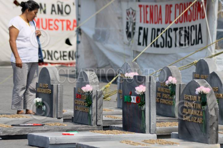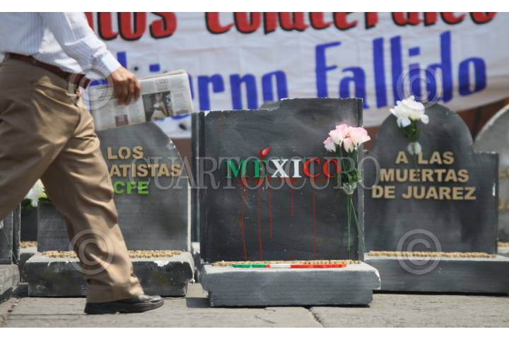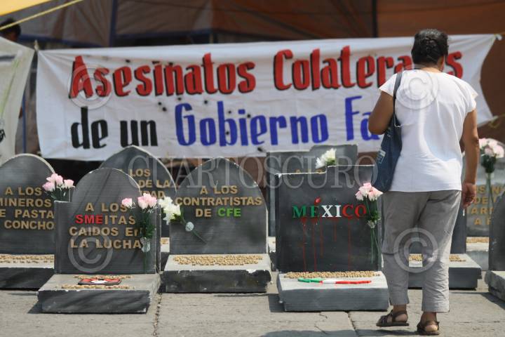 MÉXICO, D.F., 13MAYO2011.- En el campamento instalado en el Zócalo por los electricistas que pertenecían al Sindicato Mexicano de Electricistas colocaron unas lápidas simuladas con los nombres de las víctimas de la llamada "guerra contra el narcotrafico", esto según lo señalado por una manta que acompaña la instalación FOTO: MOISÉS PABLO/CUARTOSCURO.COM