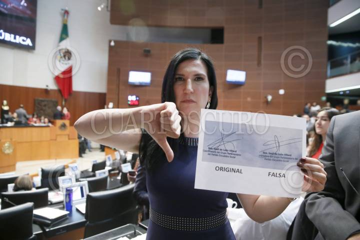 CIUDAD DE MÉXICO, 03ABRIL2019.- La panista Kenia López Rabadán acuso que la Junta de Coordinación Política (Jucopo) de falsificar la firma de la coordinadora del PES, Sasil de León Villard, quien supuestamente se encontraba ausente en la sesión, esto en el marco de la discusión sobre la elección de los comisionados de la Comisión Reguladora de Energía (CRE). FOTO: CUARTOSCURO.COM
