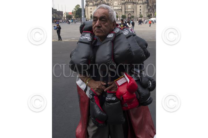 MÉXICO, D.F., 20FEBRERO2015.- Un hombre de la tercera edad se gana la vida vendiendo guantes de box y costales en las calle del Centro Histórico. FOTO: MOISÉS PABLO /CUARTOSCURO.COM