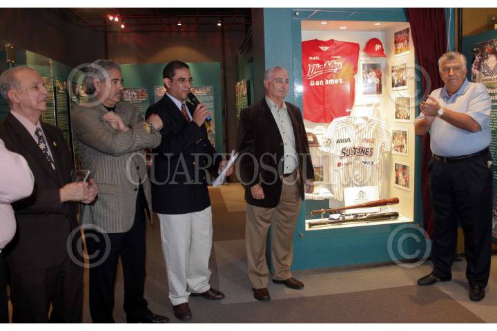 MONTERREY, NUEVO LEON, 29OCTUBRE2008.- La vitrina conmemorativa a la Serie Final de la Liga Mexicana 2008, fue inaugurada este día, en el Salón de la Fama del Béisbol Profesional de México. Estubieron presentes Alberto Saucedo Flores, director del Salón de la Fama, Roberto Mansur Galán, presidente de los Diablos Rojos del México, José Maiz García y Roberto Magadaleno Ramírez, presidente y vicepresidente de los Sultanes de Monterrey, así como Rafael Dominguez, ex director del Salón de la Fama. FOTO: CUARTOSCURO.COM