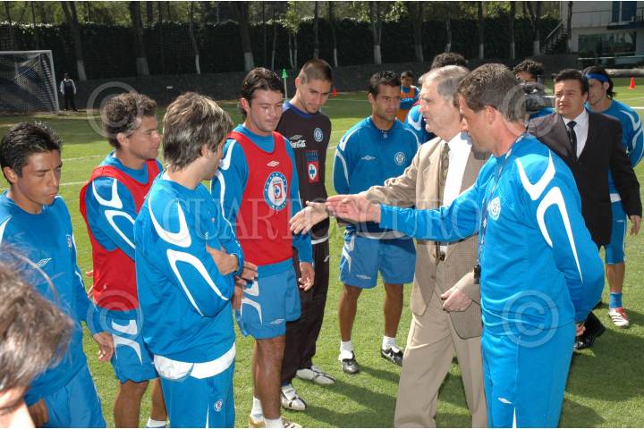 MÉXICO,D.F, 07FEBRERO2007.- El presidente del Cruz Azul, Guillermo Álvarez, estuvo de visita en La Noria. El motivo fue saludar al equipo y tambien mostrarle el Salón de la Fama del Cruz Azul a una de las leyendas del equipo : Raúl Cardenas, quien en antiguas epocas los llevó a ganar tres campeonatos seguidos. FOTO:SALON DE LA FAMA/CUARTOSCURO.COM