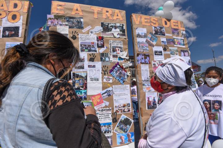 Integrantes de Haz Valer mi Libertad realizaron un periódico mural con fotos y recortes de notas de todas las actividades que han realizado los últimos meses exigiendo amnistía para sus familiares presos en penales mexiquenses.