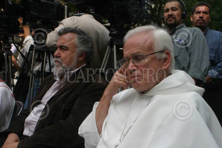 MÉXICO, D.F., 19JULIO2007.- Alejandro Encinas integrante del Frente Amplio Progresista y el obispo de Saltillo Raúl Vera acompañaron a familiares de los mineros fallecidos en Pasta de Conchos durante una protesta a las afueras de las nuevas oficinas de Grupo Minero México donde exigieron que no se cierre la mina de Pasta de Conchos y continuen los trabajos de rescate de los cuerpos de sus familiares. FOTO: SAÚL LÓPEZ/CUARTOSCURO.COM