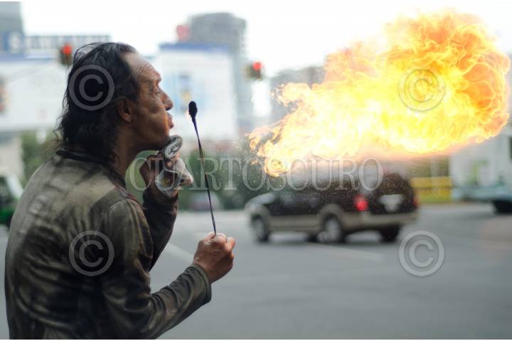MÉXICO, D.F., 29AGOSTO2011.- Un faquir realiza una exhibición con fuego en el cruce de avenida Circuito Interior con la calle de Sevilla en la colonia Cuauhtémoc. Así como el, muchas personas en situación de calle tienen que verse en la necesidad de sobrevivir mediante la realización de trucos que ponen en peligro su vida. FOTO: MISAEL VALTIERRA/CUARTOSCURO.COM