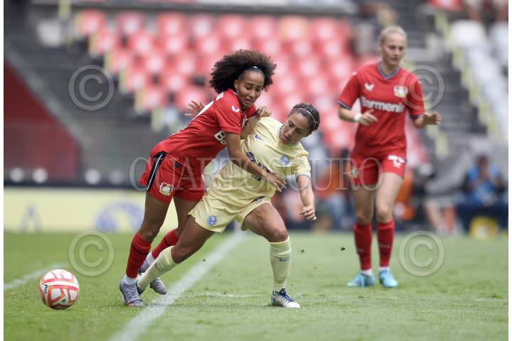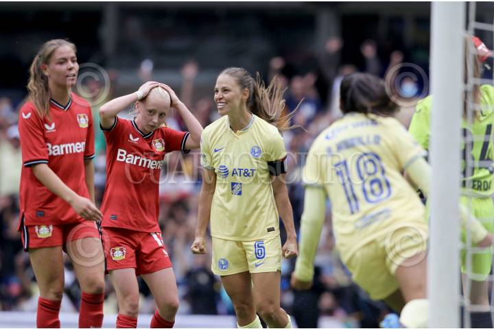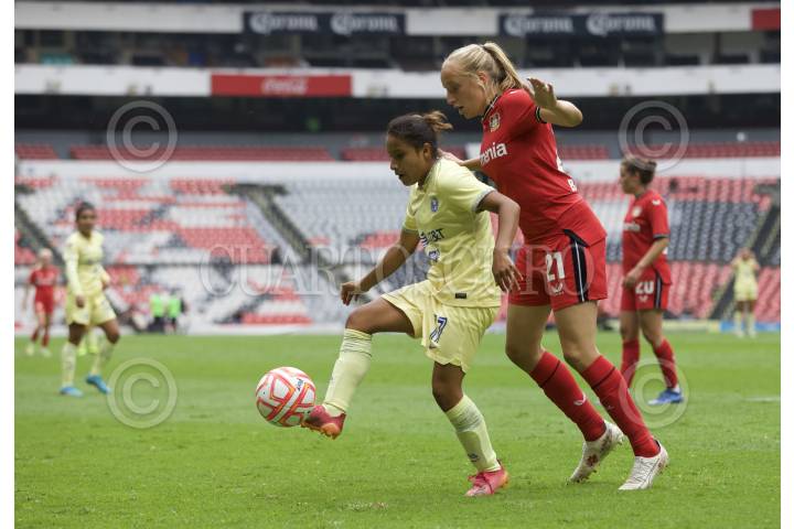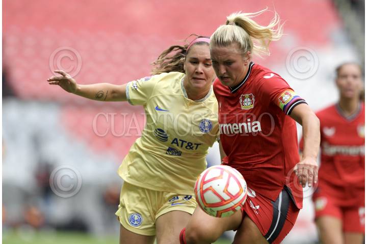 Mayra Pelayo-Bernal del América Y Vinken del Bayer durante el partido de fútbol femenil amistoso, entre el Las Águilas del América vs Bayer Leverkusen que celebra los 100 años de la farmacéutica en México; realizado en la cancha del Estadio Azteca.