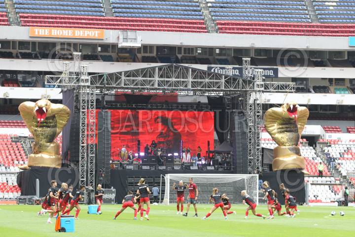 Calentamiento de jugadoras previo al partido de fútbol femenil amistoso, entre el Las Águilas del América vs Bayer Leverkusen que celebra los 100 años de la farmacéutica en México; realizado en la cancha del Estadio Azteca.