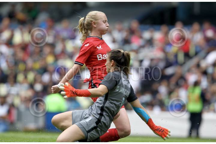 Renata Masciarelli portera del América y Siems del Bayer durante el partido de fútbol femenil amistoso, entre el Las Águilas del América vs Bayer Leverkusen que celebra los 100 años de la farmacéutica en México; realizado en la cancha del Estadio Azteca.