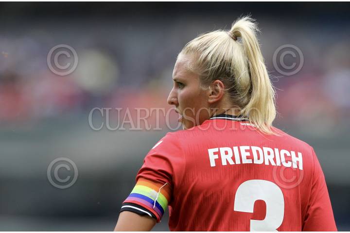 La capitana del Bayer, Friedrich durante el partido de fútbol femenil amistoso, entre el Las Águilas del América vs Bayer Leverkusen que celebra los 100 años de la farmacéutica en México; realizado en la cancha del Estadio Azteca.