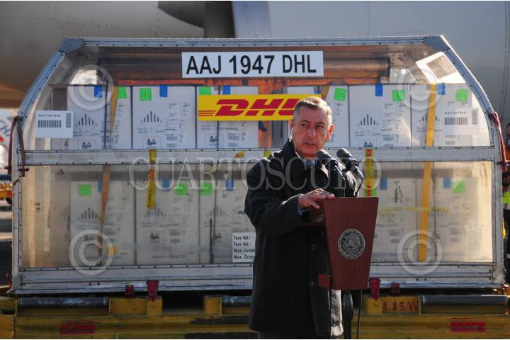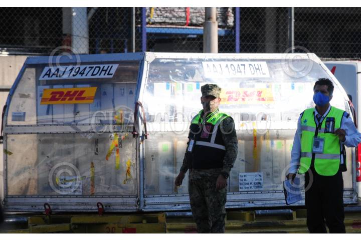 Descenso del cargamento de vacunas contra el Covid-19 en el AICM.