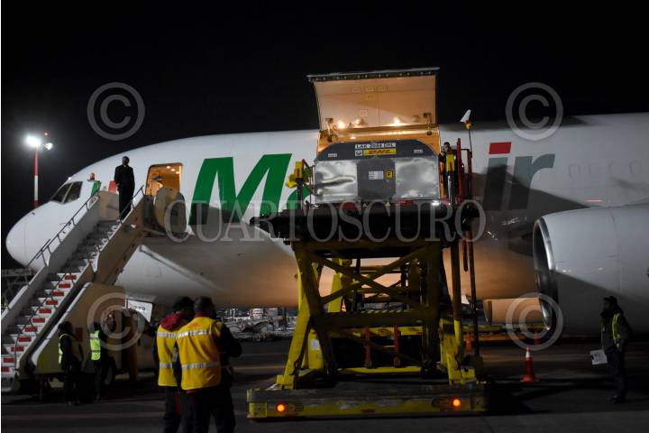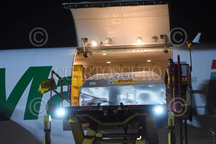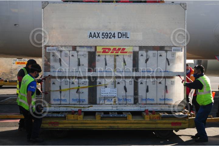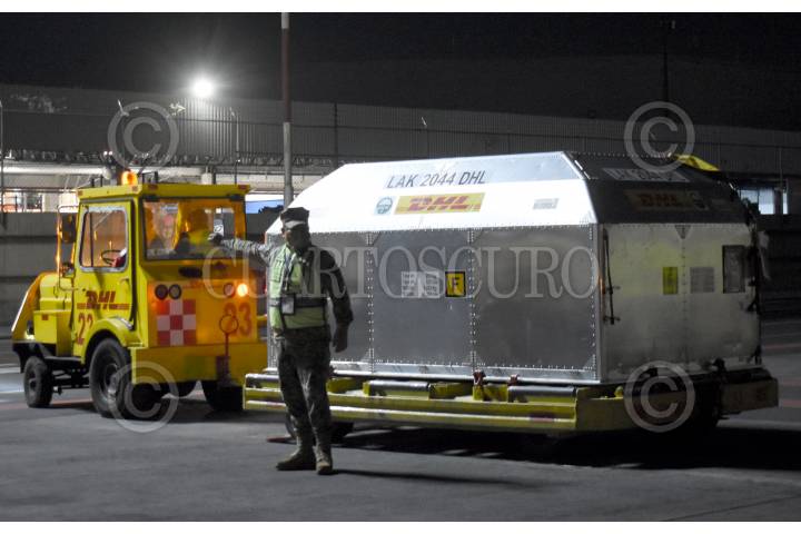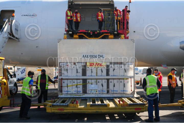 Trabajadores del aeropuerto maniobran con el cargamento de las vacunas contra el Covid-19 que llegaron esta mañana.
