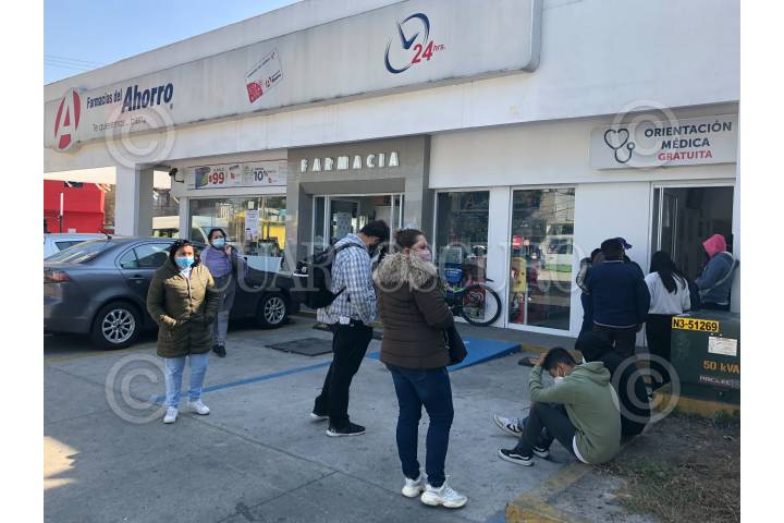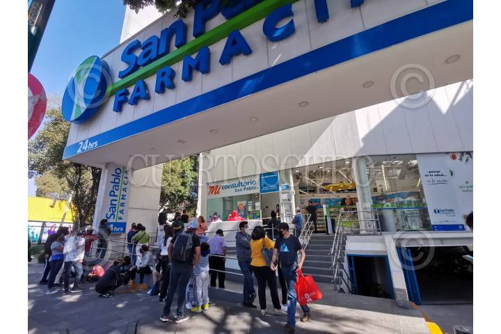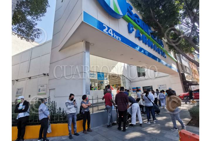 Filas de personas que buscan atención médica en una farmacia en la colonia Roma.