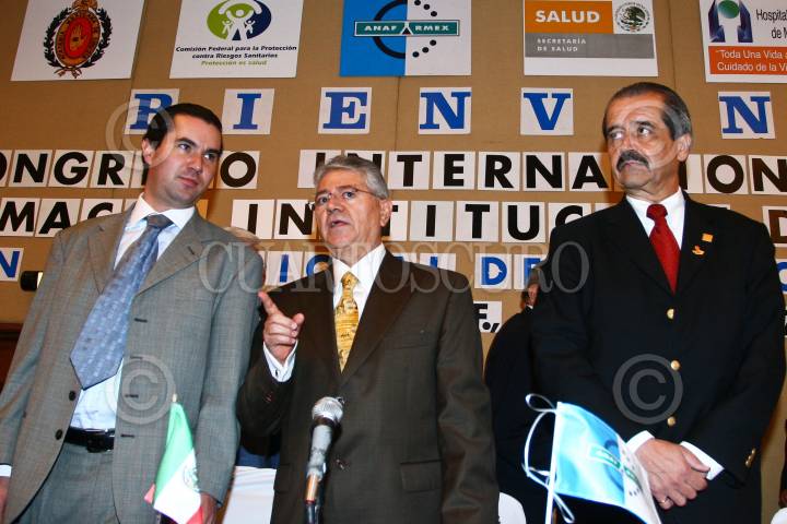 MÉXICO, D.F., 07AGOSTO20082008.- El comisionado federal para la Protección contra Riesgos Sanitarios (COFEPRIS), Miguel Angel Toscano Velasco, el presidente de Anafarmex, Antonio Pascual Feria, y el secretario de Salud, José Ángel Córdova Villalobos, durante la inauguración del XXIII Congreso Internacional de Farmacias, realizado en un hotel de la ciudad de México. FOTOS: ISAAC ESQUIVEL/CUARTOSCURO.COM