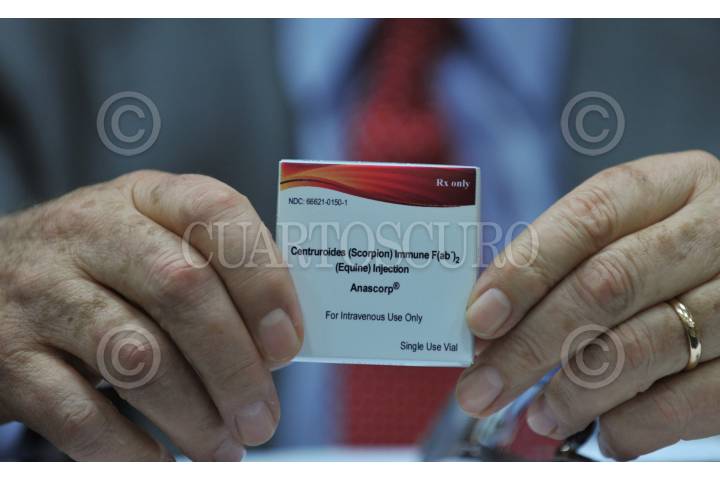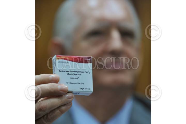 MÉXICO, D.F., 04AGOSTO2011.- En la UNAM se presentó el primer antiveneno totalmente mexicano contra picadura de alacrán, desarrollado por Alejandro Alagón Cano, investigador del Instituto de Biotecnología de la UNAM, y producido a nivel industrial en el Instituto Bioclón, del Grupo Silanes. El "Alacramym", como se ha denominado al nuevo fármaco, quedó registrado en Estados Unidos con el nombre "Anascorp". En la presentación estuvó Juan López de Sinales, presidente del Grupo Silanes quien lo esta distribuyendo en en la nación norteamericana. FOTO: GABINO ACEVEDO/CUARTOSCURO.COM