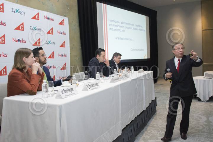 CIUDAD DE MÉXICO, 28JUNIO2017.- Francisco Larrondobuno, gerente de Marca y Comunicación para Chinoin (laboratorio mexicano farmaceutico) ; César García Granados, jefe de producto para Chinoin; Sandra Hagsater, directora de marketing, y los médicos José Luis Sánchez Mejía y Gabriel Tona, durante la presentación de los dos nuevos medicamentos de este laboratorio mexicano., para el tratamiento de la rinitis y el dolor neuropático, los cuales se suman a la cartera de opciones terapéuticas a nivel nacional. FOTO: MARIO JASSO /CUARTOSCURO.COM