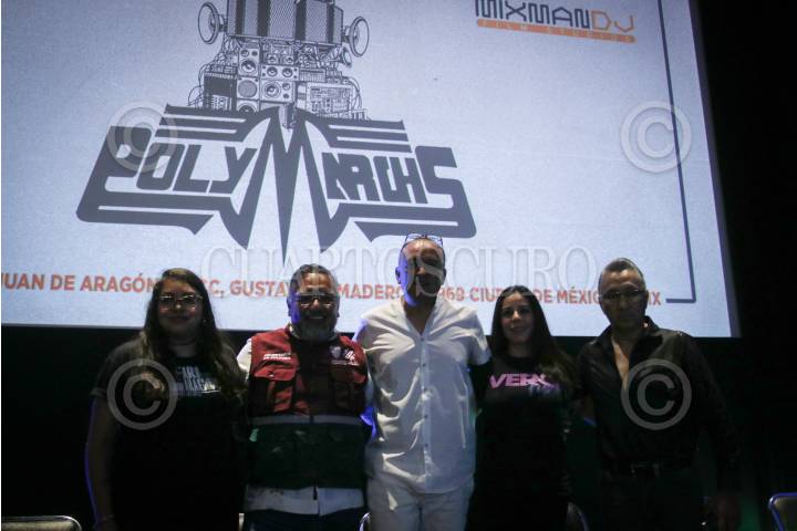 CIUDAD DE MÉXICO, 18AGOSTO2025.- Insulini y los espantaduegras, Zemmoa, Soni Trans y Tiempo Prieto durante la conferencia de prensa del 9º aniversario del FARO Aragón, en la que anunciaron su participación e l próximo domingo 24 de agosto en las instalaciones de estés espacio cultural. El acto de realizó en la sala de cine "Corregidora" del FARO Aragón. FOTO: GRACIELA LÓPEZ/CUARTOSCURO.COM
