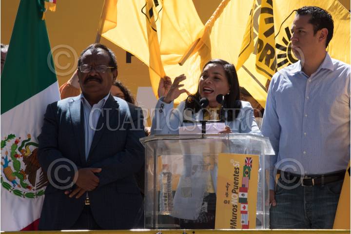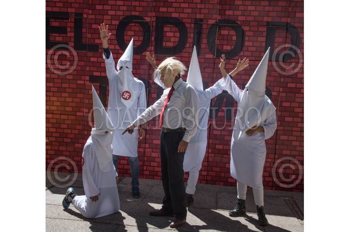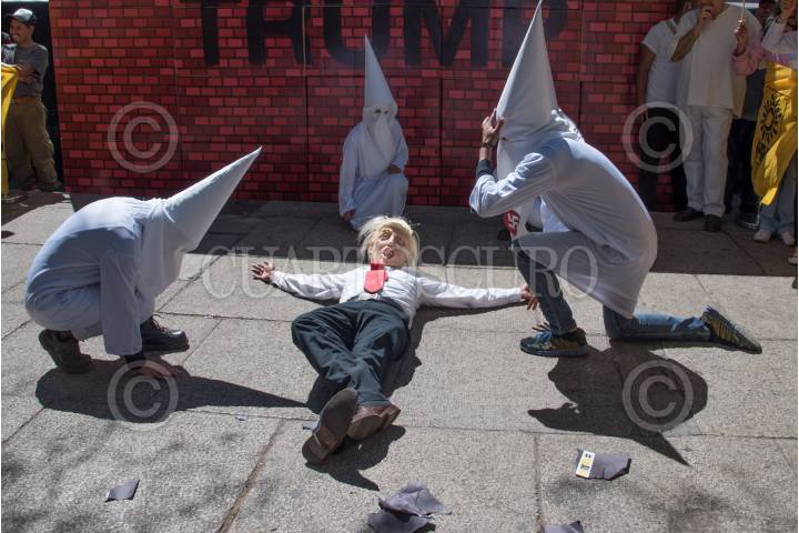 CIUDAD DE MÉXICO, 20FEBRERO2017.- Beatriz Mojica Morga, Secretaria General del Partido de la Revolución Democrática (PRD) y Alejandro Sánchez Camacho, Secretario de Acción Política, encabezaron una concentración a un costado de la Embajada de Estados Unidos con el propósito de rechazar las propuestas migratorias del nuevo presidente del país norteamericano, Donald Trump. En la manifestación, un grupo artístico realizó un performance contra el racismo. FOTO: TERCERO DÍAZ /CUARTOSCURO.COM