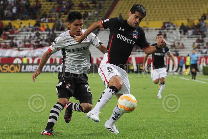 GUADALAJARA, JALISCO. 07ABRIL2015.- El jugador del Atlas de Guadalajara (México), Juan Carlos Medina, disputa un balón frente al contrario del Colo Colo (Chile), Luis Pedro Figueroa, esto en partido correspondiente a la Fase de grupos de la Copa Bridgestone Libertadores, en donde se enfrentan los equipos del Atlas de Guadalajara (México) frente al Colo Colo (Chile), en el Estadio Jalisco. FOTO: FERNANDO CARRANZA GARCIA / CUARTOSCURO.COM