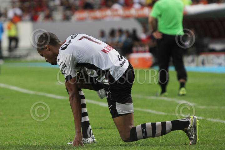 GUADALAJARA, JALISCO. 07ABRIL2015.- El jugador del Atlas de Guadalajara (México), Marcos Da Silva se lamenta ante una falta, esto en partido correspondiente a la Fase de grupos de la Copa Bridgestone Libertadores, en donde se enfrentan los equipos del Atlas de Guadalajara (México) frente al Colo Colo (Chile), en el Estadio Jalisco y en donde al final el marcador fue de 3-1 a favor del equipo chileno. FOTO: FERNANDO CARRANZA GARCIA/CUARTOSCURO.COM