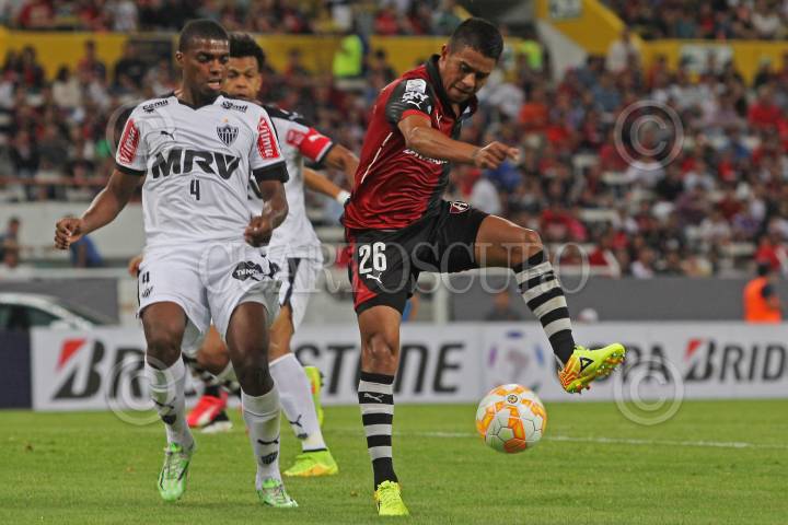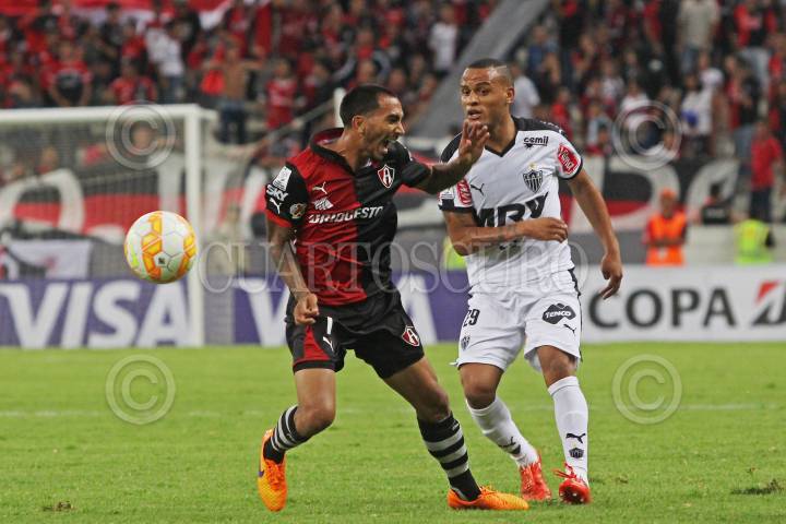 GUADALAJARA, JALISCO. 15ABRIL2015.- El jugador del Atlas de Guadalajara (México), Edgar Castillo, disputa un balón frente al contrario del Atlético Mineiro (Brasil), Luan Madson, esto en partido correspondiente a la Fase de grupos de la Copa Bridgestone Libertadores, en donde se enfrentan los equipos del Atlas de Guadalajara (México) frente al Atlético Mineiro (Brasil), en el Estadio Jalisco. FOTO: FERNANDO CARRANZA GARCIA/CUARTOSCURO.COM