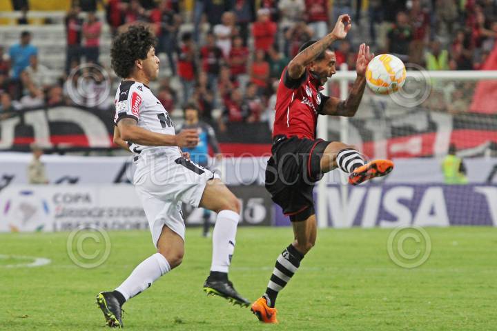 GUADALAJARA, JALISCO. 15ABRIL2015.- El jugador del Atlas de Guadalajara (México), Luies Gerardo Venegas, disputa un balón frente al contrario del Atlético Mineiro (Brasil), Jemerson de Jesús, esto en partido correspondiente a la Fase de grupos de la Copa Bridgestone Libertadores, en donde se enfrentan los equipos del Atlas de Guadalajara (México) frente al Atlético Mineiro (Brasil), en el Estadio Jalisco.FOTO: FERNANDO CARRANZA GARCIA/CUARTOSCURO.COM