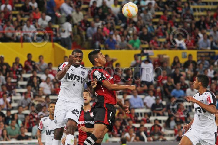 GUADALAJARA, JALISCO. 15ABRIL2015.- El jugador del Atlas de Guadalajara (México), Juan Carlos Medina, disputa un balón frente al contrario del Atlético Mineiro (Brasil), Jemerson de Jesús, esto en partido correspondiente a la Fase de grupos de la Copa Bridgestone Libertadores, en donde se enfrentan los equipos del Atlas de Guadalajara (México) frente al Atlético Mineiro (Brasil), en el Estadio Jalisco. FOTO: FERNANDO CARRANZA GARCIA/CUARTOSCURO.COM
