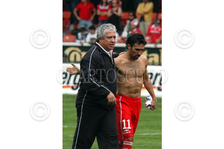 TOLUCA, ESTADO DE MÉXICO 03DICIEMBRE2006.- El director técnico, Américo Gallego felicita a Vicente Sánchez autor del gol de los Diablos Rojos del Toluca con el que venció a los Tuzos del Pachuca, con lo cual se convierte en el primer finalista del torneo de apertura del fútbol mexicano. FOTO: GUILLERMO PEREA /CUARTOSCURO.COM