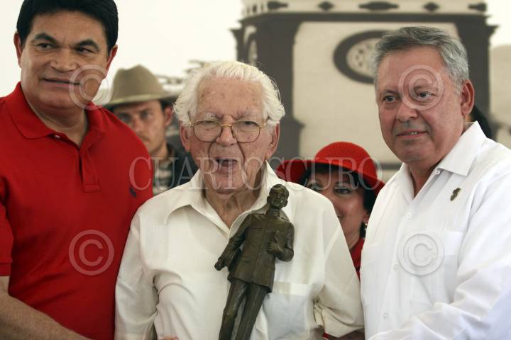 MOCORITO, SINALOA, 31MARZO2012.- El gobernador del estado de Sinaloa Mario Lopez Valdez acompañado del director Felipe Cazals, asi como los protagonistas; Damian Alcazar, Sebastián Zurita y Marimar Vega dieron el pizarrazo del largometraje "El Ciudadano Buelna". La cita trata de la vida y obra de Rafael Buelna, personaje histórico en los tiempos de la Revolución Mexicana, quien nació en Mocorito el 27 de marzo el 1891 y murió en Morelia el 23 de enero de 1924. Posteriormente en el emiciclo dedicado a este personaje se le entrego un reconocimiento al hijo del "granito de oro", Pablo Buelna, por parte de la Universidad Autónoma de Sinaloa. FOTO: RASHIDE FRIAS /CUARTOSCURO.COM