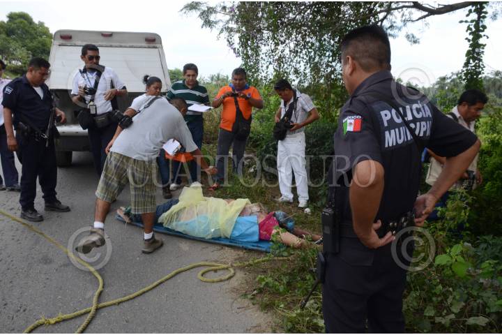 ACAPULCO, GUERRERO, 23NOVIEMBRE2013- Al rededor de las 16:30 horas fue reportado a las autoridades mediante una llamada anónima el cuerpo de una mujer asesinada frente al Panteón de Tunzingo. Al arribar al lugar ubicado sobre la carretera El Salto - Tunzingo los agentes policíacos hallaron el cuerpo de una persona del sexo femenino privada de la vida al parecer por asfixia puesto que tenía una bolsa de color azul en el rostro y estaba en posición de cubito fetal con las manos amarradas en la espalda. La zona fue acordonada por elementos policiacos de diversas corporaciones para que el Agente del Ministerio Publico sector Coloso diera fe de los hechos y ordenara al SEMEFO el levantamiento el cuerpo fue trasladado al servicio médico forense en calidad de desconocida. FOTO: BERNANDINO HERNÁNDEZ /CUARTOSCURO.COM