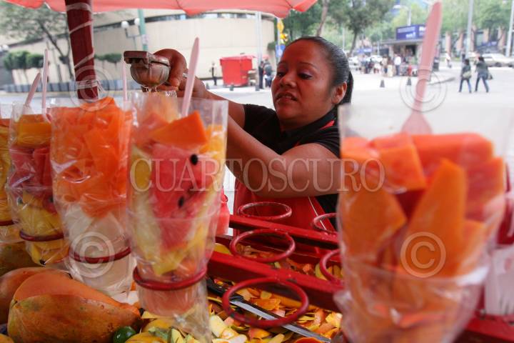 MÉXICO, D.F., 06MARZO2010.- Una señora prepara y vende fruta picada en el centro de la ciudad de México, donde a diario miles de mujeres buscan ganarse el sustento económico para sus familias. En el marco del Día Internacional de la Mujer, el próximo 8 del presente, las mujeres de todo el país buscan ganar espacios en diversas áreas de la economía, la política, el deporte, etcétera. FOTO: ISAAC ESQUIVEL/CUARTOSCURO.COM