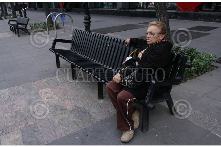 MÉXICO, D.F., 06MARZO2010.- Una señora toma un descanso en una de las bancas ubicadas sobre avenida Juárez, en el Centro de la ciudad. En el marco del Día Internacional de la Mujer, el próximo 8 del presente, las mujeres de todo el país buscan ganar espacios en diversas áreas de la economía, la política, el deporte, etcétera. FOTO: ISAAC ESQUIVEL/CUARTOSCURO.COM