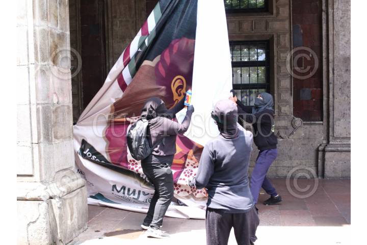 CUERNAVACA, MORELOS, 07SEPTIEMBRE2025.- Feministas del Bloque Negro desprenden pendones de mujeres de la Independencia colocados en los portales del Palacio de Gobierno de Morelos, donde pintaron leyendas en contra de la Fiscalía de Justicia y la gobernadora Margarita González Saravia por el feminicidio de Maylin Chino. Andrea Maylin Chino Ramos de 22 años fue reportada como desaparecida el pasado 20 de junio en el municipio de Yautepec; la joven era madre de una niña de año y medio de edad y presuntamente fue asesinada por su pareja sentimental el cual la inhumo en un terreno de Yautepec. Los padres de la victima acusan falta de profesionalismo de la Fiscalía de Justicia ya que no han clasificado el caso como feminicidio, además de tratar de encubrir al asesino y a su familia, también exigen una audiencia con la gobernadora. FOTO: MARGARITO PÉREZ RETANA/CUARTOSCURO.COM