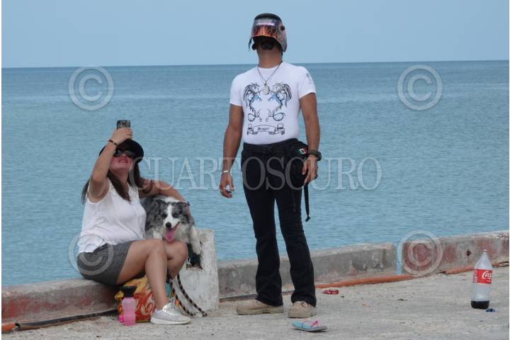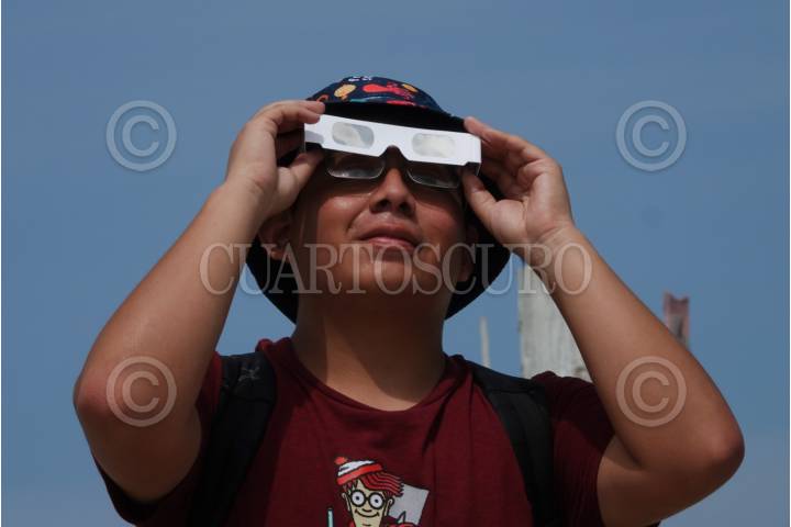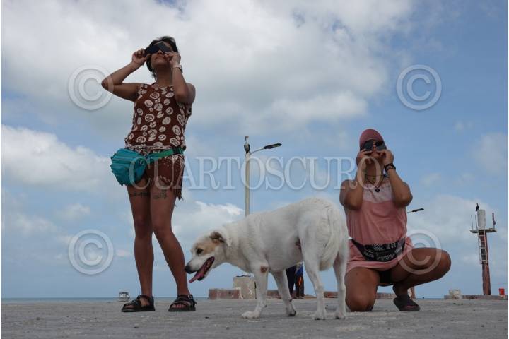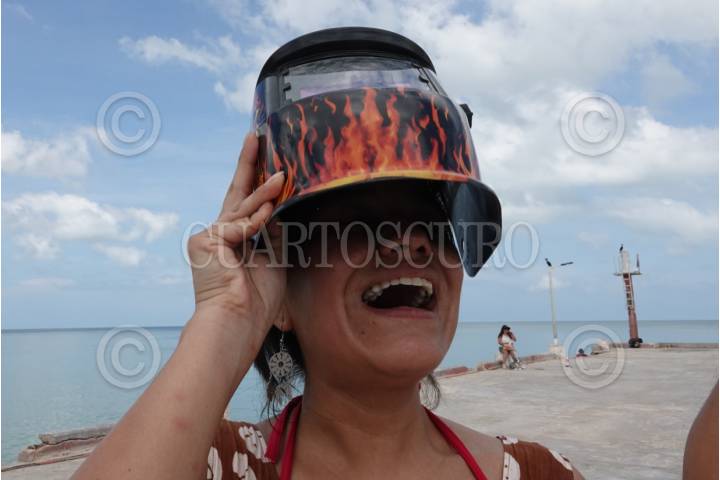 SISAL, YUCATÁN, 14OCTUBRE2023.- Turistas y locatarios observaron con filtros solares y gafas el fenómeno del Eclipse Anular Solar en el muelle de la playa de Sisal. FOTO: GRACIELA LÓPEZ CUARTOSCURO.COM