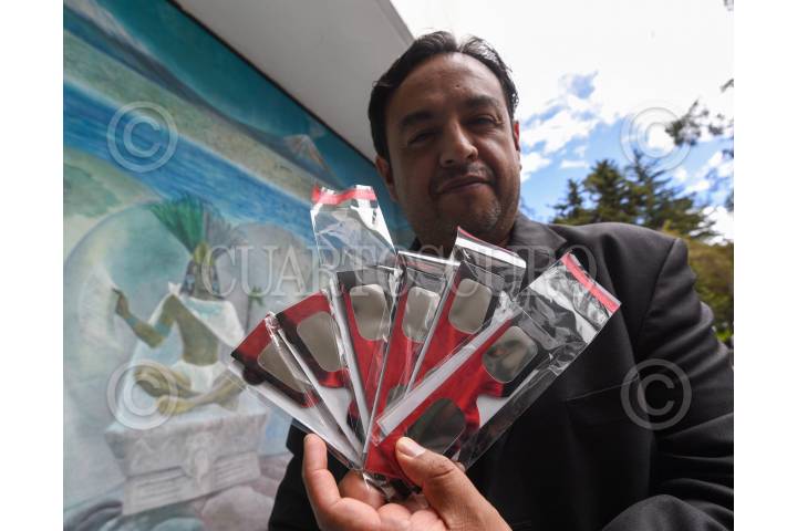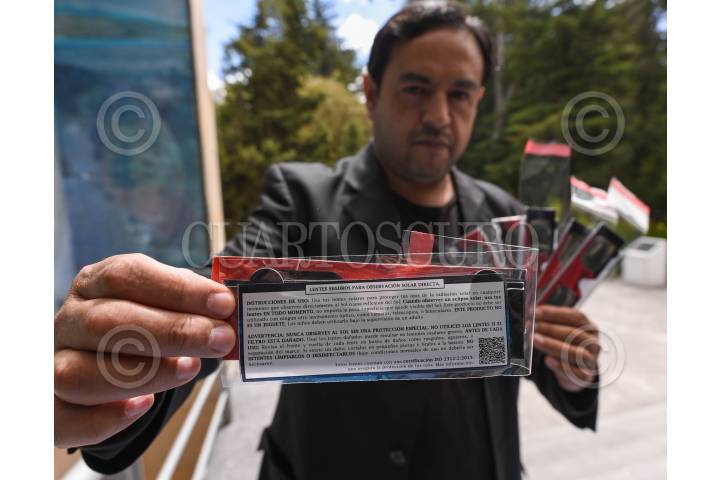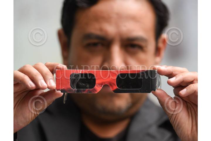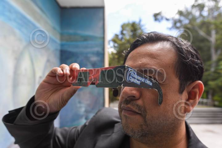 TOLUCA, ESTADO DE MÉXICO, 10OCTUBRE2023.- Selín Alejandro González Palomino Presidente de la Asociación Astronómica del Valle de Toluca realizó una serie de recomendaciones a la población para poder observar el próximo 14 de octubre el eclipse solar, que se apreciará como anular en estados del sureste de México y el resto del del territorio lo apreciará parcial, es un evento importante ya que la luna cubrirá casi en un 75 por ciento al sol; dentro de las recomendaciones para ver este eclipse enfatizó en no usar radiografías, rollos de película, celofán, ver en reflejo de agua, lentes oscuros, o ver de manera directa el sol, pero si se pueden ocupar lentes para eclipse, el material del que estan hechos es polímero negro, diseñado para oscurecer el sol y quitar la radiación que viene del sol, el vidrio de soldador del número 14 pero se limita su uso a tan solo 10 segundos y descansar. El eclipse inicia en el Valle de Toluca a las 9:36, el máximo a las 11:08 y culmina a las 12:49, durará 3 horas 13 minutos, durante ese tiempo hay que estar protegidos, en su perfil de Facebook la gente puede consultar los puntos para adquirir los lentes y puedan observar este fenómeno con seguridad; la Asociación Astronómica del Valle de Toluca estarán transmitiendo en vivo el eclipse para que la gente pueda ver también a través de estos medios y una parte de su equipo viajará a Campeche y otra parte estará en el Parque De la Ciencia Fundadores en donde instalarán telescopios y estarán dando la oportunidad de poder observar a través de telescopios y tener una explicación por parte de especialistas. FOTO: CRISANTA ESPINOSA AGUILAR /CUARTOSCURO. COM