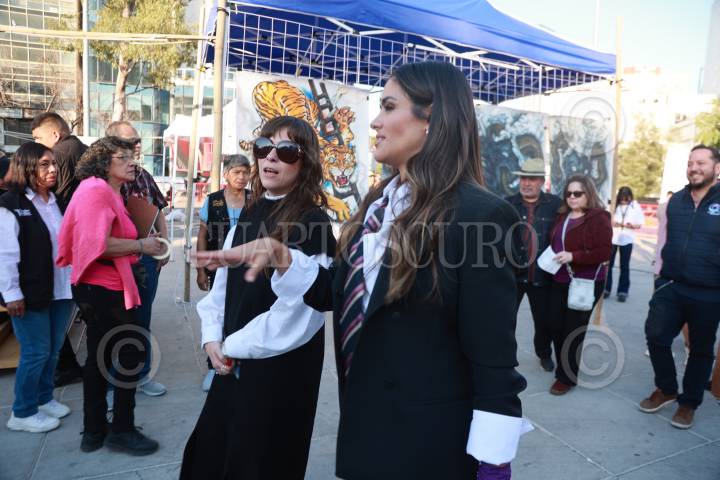 CIUDAD DE MÉXICO, 07FEBRERO2025. La alcaldesa de Cuauhtémoc, Alessandra Rojo de la Vega junto a la encargada de cultura de la demarcación Alejandra Sánchez González recorren la Feria de Arte Independiente a Cielo Abierto (FERAL), que estara instalada en el Monumento a la Madre los días 7, 8 y 9 de febrero, donde se concentrarán proyectos, iniciativas y galerías de arte independiente. FOTO: EDGAR NEGRETE LIRA/CUARTOSCURO.COM