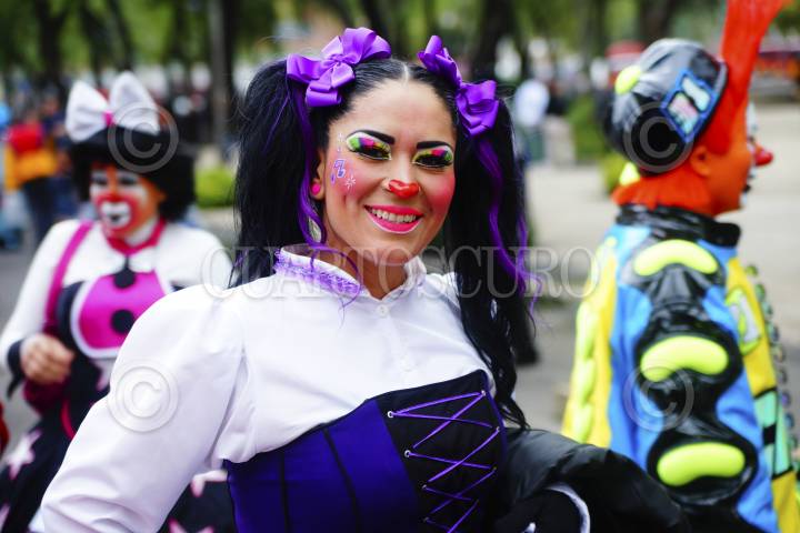MÉXICO, D.F., 23OCTUBRE2013.- En el paseo de la Reforma marcharon "Los payasos de la Feria de la Risa", quienes presumieron sus trajes multicolor y sus disfraces a los peatones y a quienes circulaban desde sus automoviles. FOTO: ALEJANDRO NEYRA /CUARTOSCURO.COM