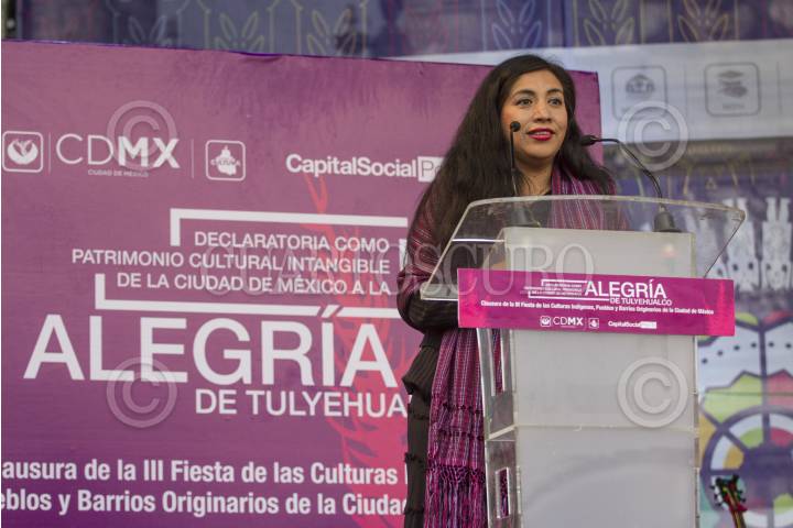 CIUDAD DE MÉXICO, 04SEPTIEMBRE2016.- Fabiola Poblano, presidenta del Consejo de Pueblos Indígenas y Barrios local, durante la ceremonia de clausura de la Feria de las Culturas Indígenas, Pueblos y Barrios Originarios de la Ciudad de México en el Zócalo, en donde se realizó la declaratoria de la Alegría de Tulyehualco como Patrimonio Cultural Intangible de la capital del país. FOTO: ISAAC ESQUIVEL /CUARTOSCURO.COM