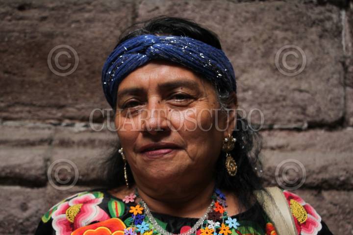 Adriana Zoraida Marcos, representante de la comunidad purépecha, posó para una foto al término de una conferencia de prensa para anunciar que la VIII Feria de las Culturas Indígenas, Pueblos y Barrios Originarios de la Ciudad de México se llevará a cabo del 5 al 21 de agosto en el Zócalo capitalino