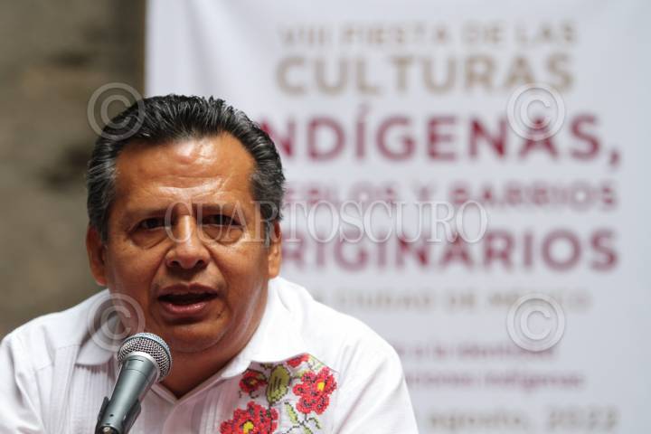 José Luis Castro, representante del INPI, durante una conferencia de prensa para anunciar que la VIII Feria de las Culturas Indígenas, Pueblos y Barrios Originarios de la Ciudad de México se llevará a cabo del 5 al 21 de agosto en el Zócalo capitalino