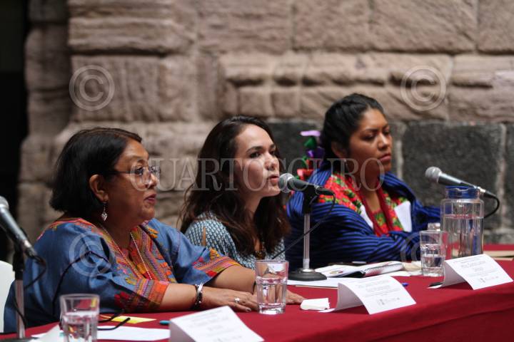 Florentina Santiago Ruíz, representante de la comunidad zapoteca, durante una conferencia de prensa para anunciar que la VIII Feria de las Culturas Indígenas, Pueblos y Barrios Originarios de la Ciudad de México se llevará a cabo del 5 al 21 de agosto en el Zócalo capitalino