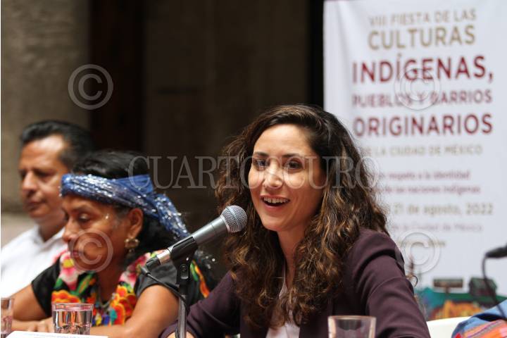 Laura Ita Andehui Ruíz Mondragón, secretaria de Pueblos y Barrios Originarios y Comunidades Indígenas residentes en la Ciudad de México, durante una conferencia de prensa para anunciar que la VIII Feria de las Culturas Indígenas, Pueblos y Barrios Originarios de la Ciudad de México se llevará a cabo del 5 al 21 de agosto en el Zócalo capitalino